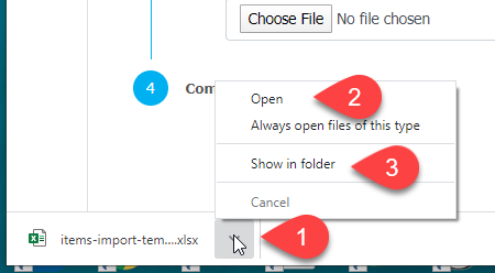 1. To download a copy of the Excel Items template. When you press the Download Template you will see the download process happening in the bottom left hand corner of your screen. When it stops, if you select the small up arrow (1) this will open a menu to either, Open (2) the spreadsheet or (3) show in folder.