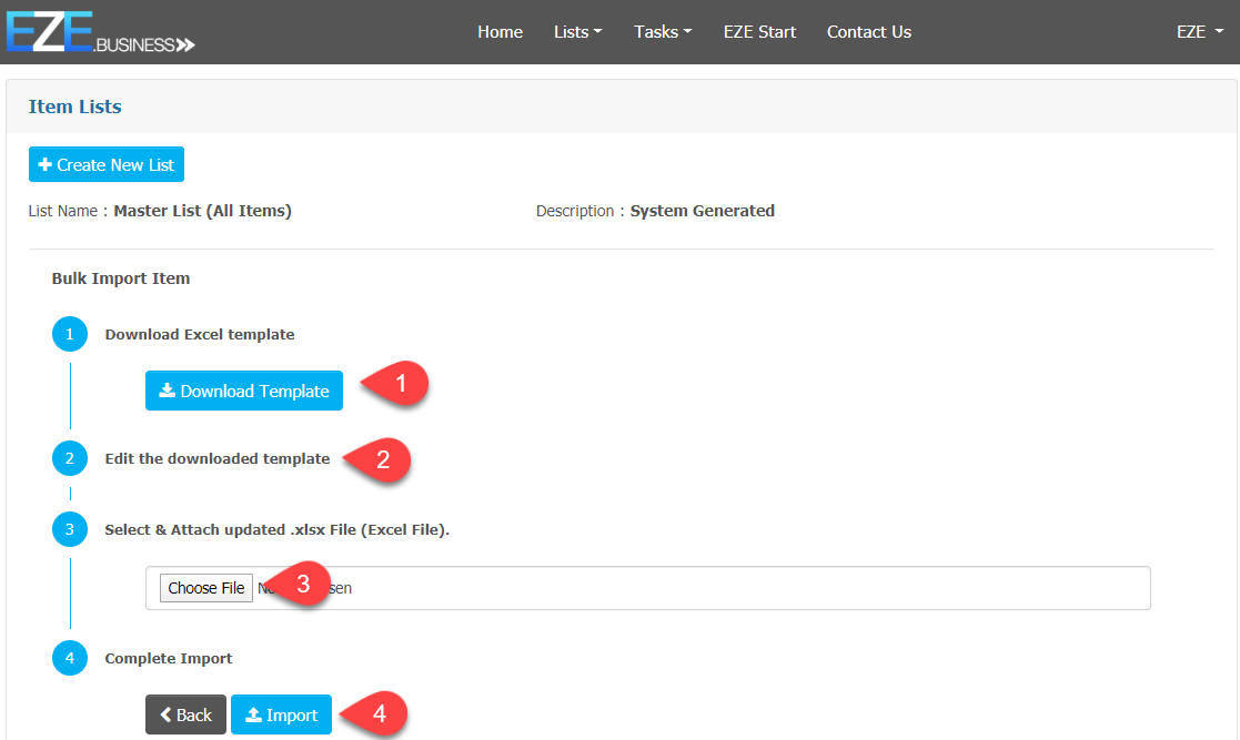 3. To import the completed List of Items from the spreadsheet, press the CHOOSE FILE button and locate your completed spreadsheet.